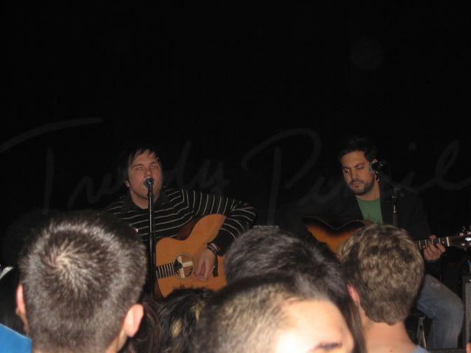 Yes it is the Ataris, or at least two of them. Singer, writer, rhythm guitar himself Kristopher Roe and good friend and Back-up singer, writer, guitar John Collura. After some tinkering with the audio and settings on stage, they did their magic and no one was disappointed. They did an awesom live act, very intimate. The set was composed with about eight to ten songs total along with a few songs from their new up comming album Welcome the Night due late March early April (possibly later than earlier...Sony/Columbia is being an ass). In the end, we left in a satisfied daze and numb legs. Got home at almost 2am, but it was totally worth it.